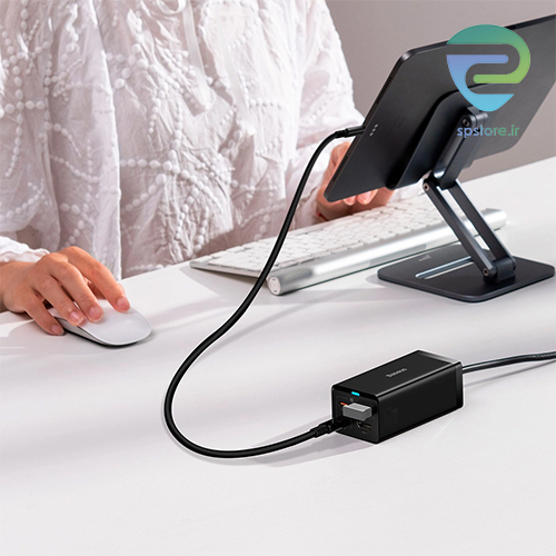 شارژر رومیزی Baseus GaN5 Pro با فناوری PD 67W توانایی شارژ سریع لپتاپ، تبلت یا گوشی را دارد. کاربران میتوانند دستگاههایی مانند MacBook Air، iPad Pro یا گوشیهای سامسونگ و شیائومی را با سرعت بالا شارژ کنند. این شارژر بدون افت ولتاژ، توان را به شکل هوشمند میان پورتها تقسیم میکند.